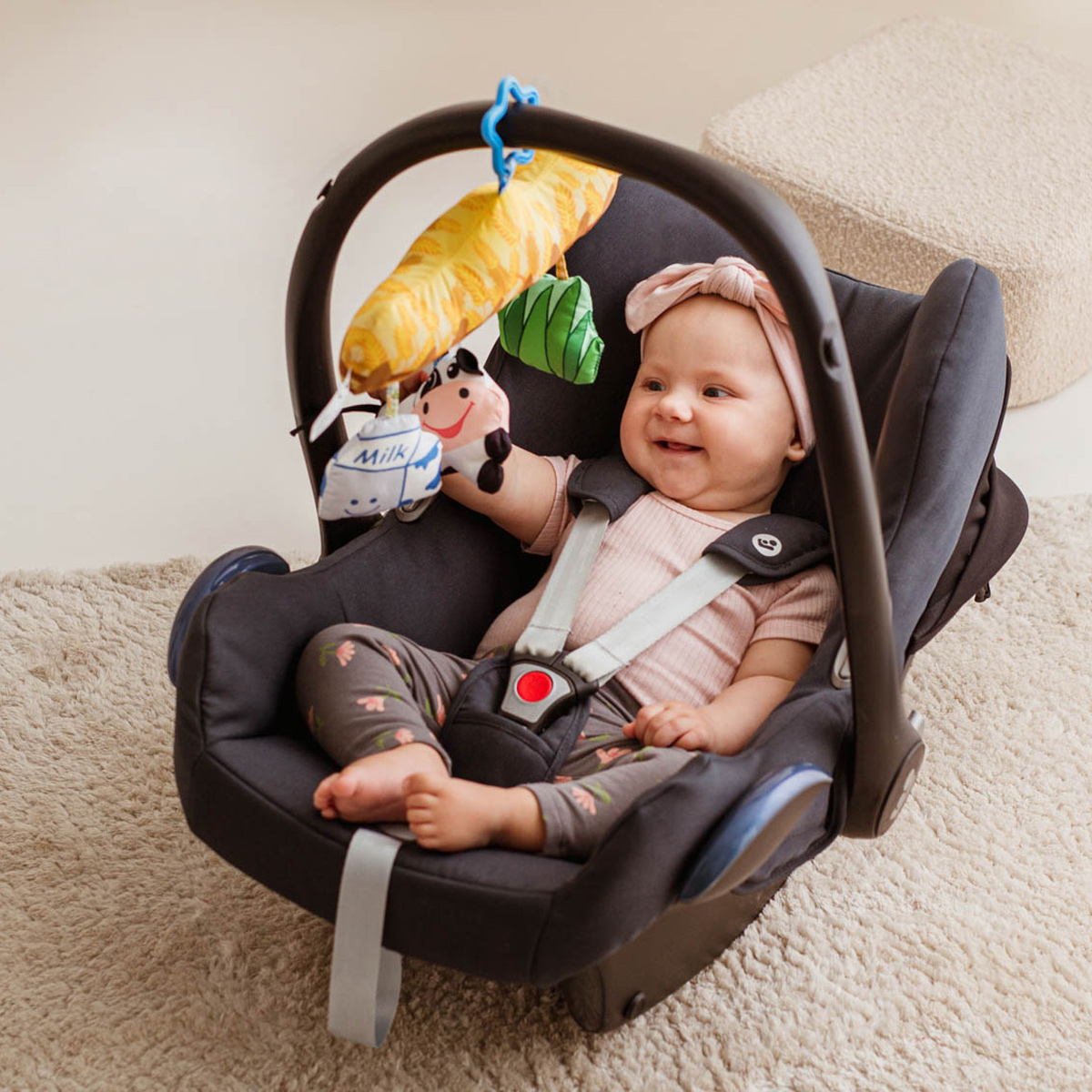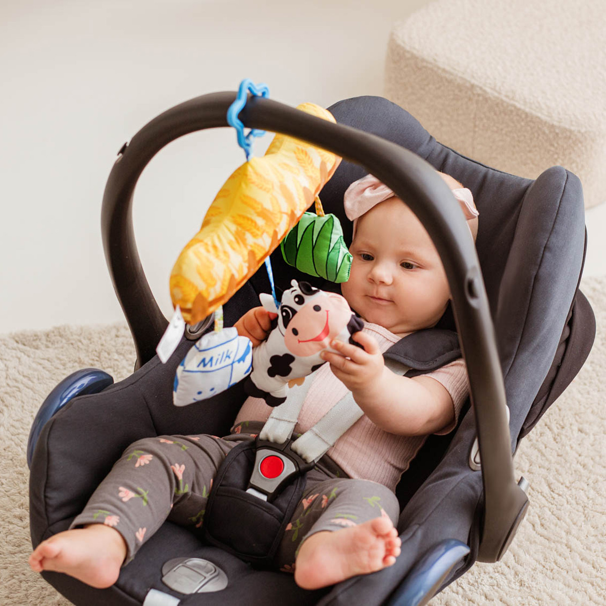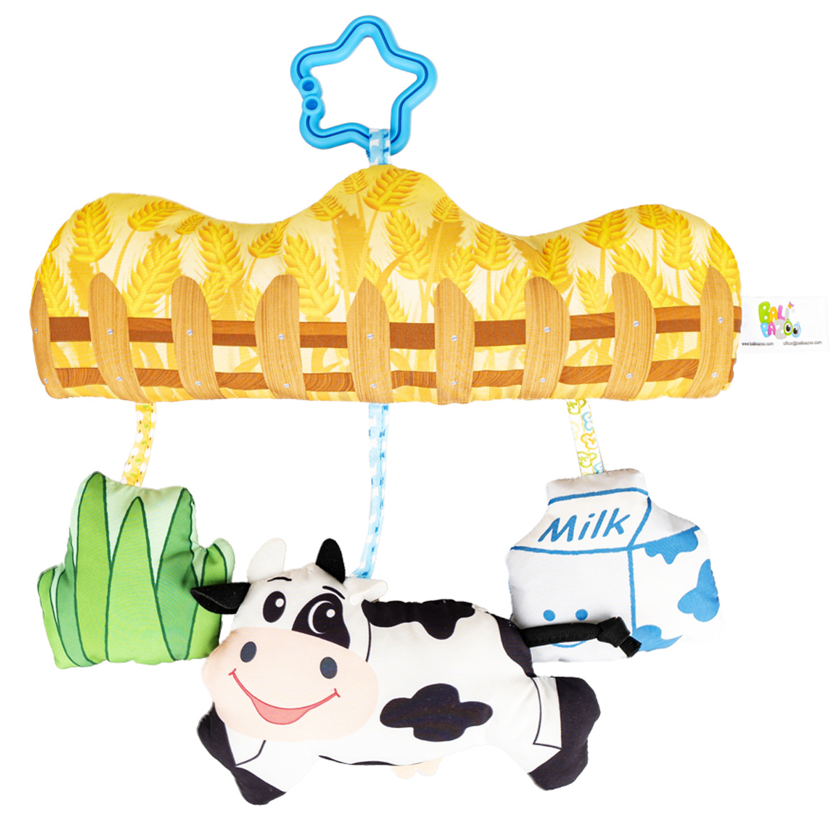 Kolorowa zawieszka, wypełniona dźwiękowymi niespodziankami, zaprasza maluchy na sensoryczną wycieczkę do wiejskiej zagrody! Znajdziemy tu, poza górnym panelem, ozdobionym kłosami pszenicy i płotkiem, krówkę, karton mleka oraz kępkę trawy.