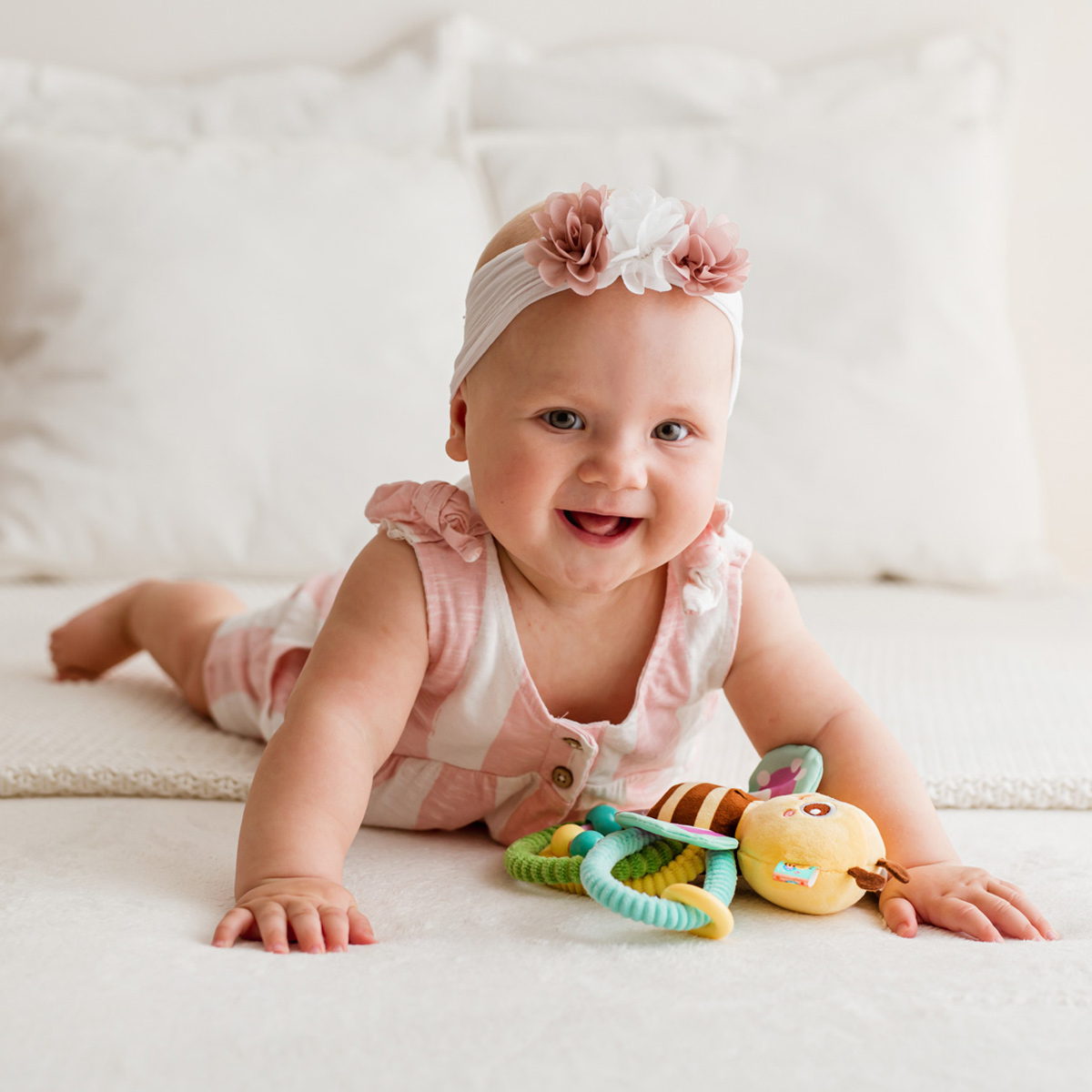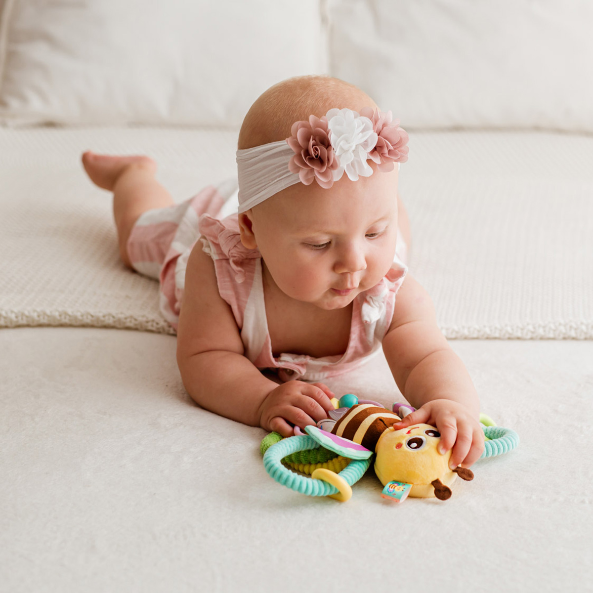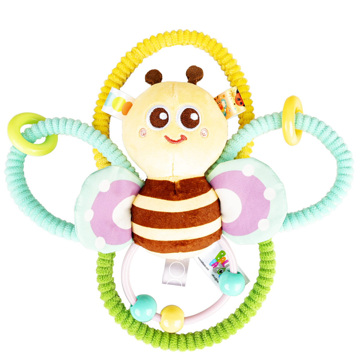 Ta urocza pszczółka na pętelkowym kwiatku stymuluje zmysły malucha do wesołej zabawy! W jej środku kryje się dzwoneczek, który wydaje dźwięk przy każdym potrząśnięciu zabawką. Kolorowe pętelki są elastyczne, a ich kształt został dopasowany do dziecięcych rączek, ułatwiając tym samym maluchom chwytanie zabawki.
