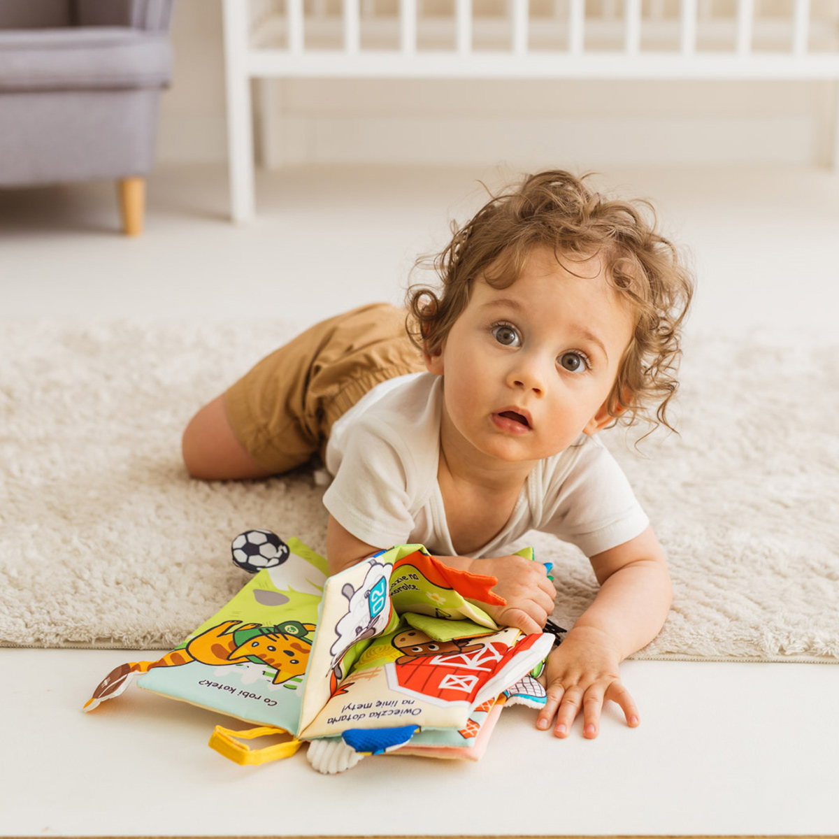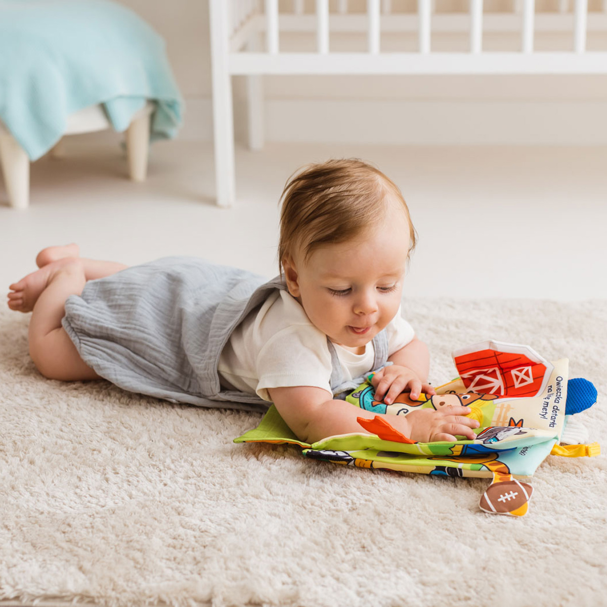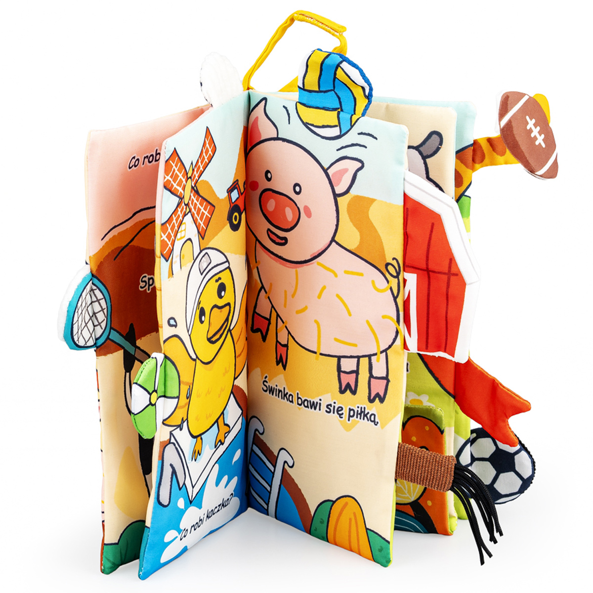 Wiejskie zwierzątka zapraszają maluszki do wspólnej zabawy w oglądanie obrazków i odkrywanie zróżnicowanych faktur materiałów! Książeczka wyposażona została w szeleszczącą okładkę i barwne strony, z których wystają różne, materiałowe elementy. Na poszczególnych stronach na najmłodszych czekają krótkie zdania w języku polskim, nawiązujące do obrazków. Praktyczna zawieszka pozwala przyczepić książeczkę w dowolnym miejscu, aby mogła towarzyszyć maluchowi podczas zabawy w domu, a także na spacerze. Produkt przeznaczony jest dla dzieci od dnia narodzin.