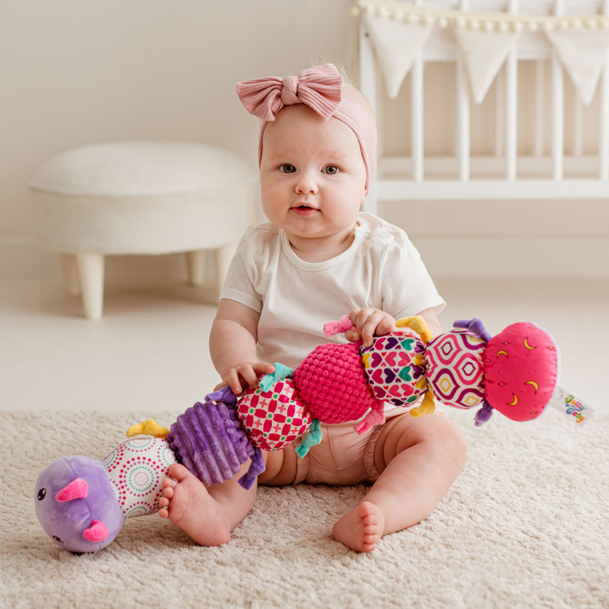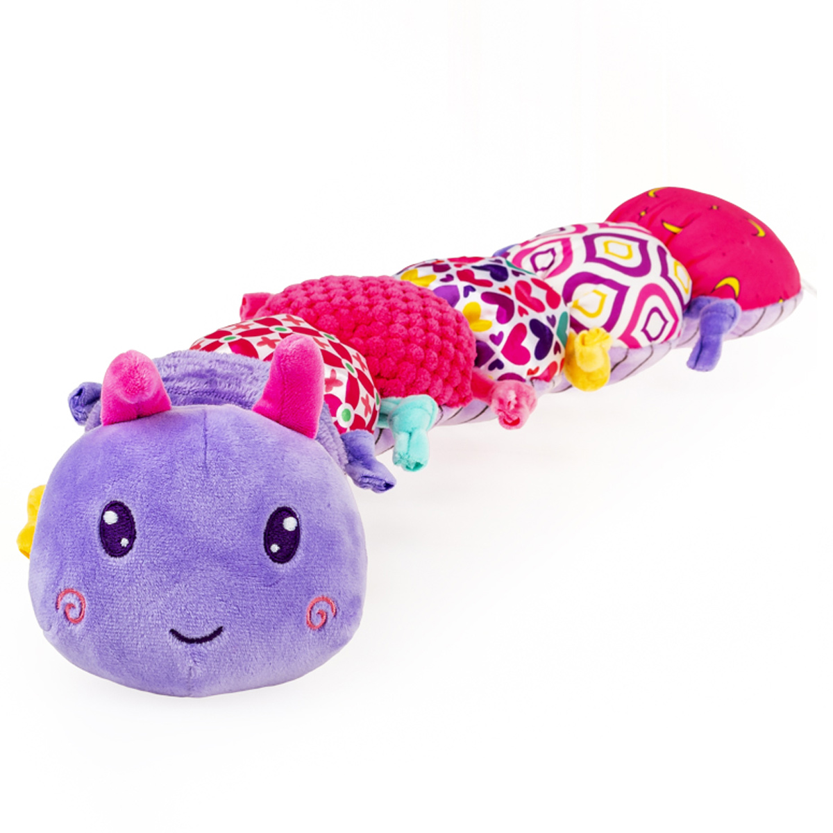 Kolorowa gąsieniczka grzechocze wesoło, zachęcając maluchy do wspólnej zabawy! Poszczególne segmenty jej ciałka uszyte zostały z materiałów o różnych fakturach, w tym takiego, który szeleści, a wszystko po to, aby stymulować zmysły dziecka, wpływając korzystnie na rozwój jego zdolności poznawczych.